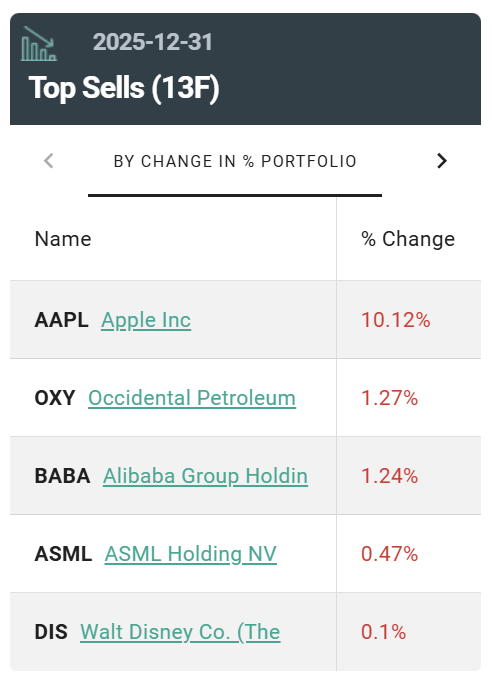 13F握仓表露浮现,2025年四季度,段永平减握了苹果、西方石油、阿里巴巴、迪士尼、阿斯麦。