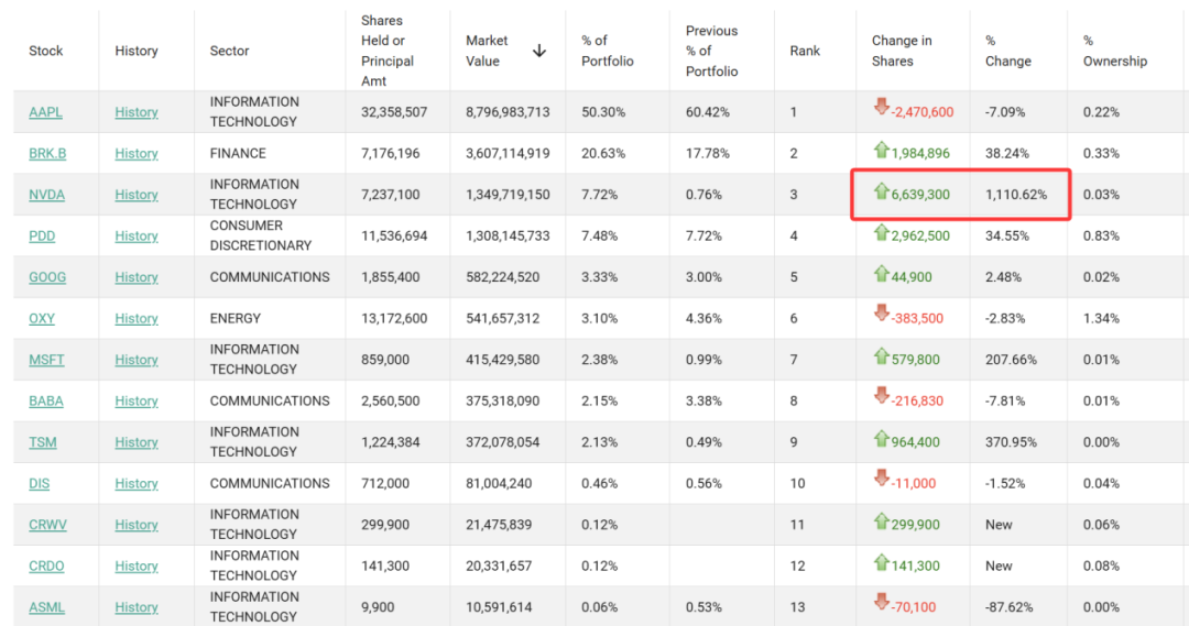 在2025年第一季度建仓英伟达之后,段永平在第四季度瞬息再度动手,大举增握663.93万股,握仓数目激增1110.62%,总握股数达到723.71万股,握仓市值跃升至13.5亿好意思元,成为其投资组合中的第三大重仓股(占比为7.72%,前一季度仅为0.76%)。
